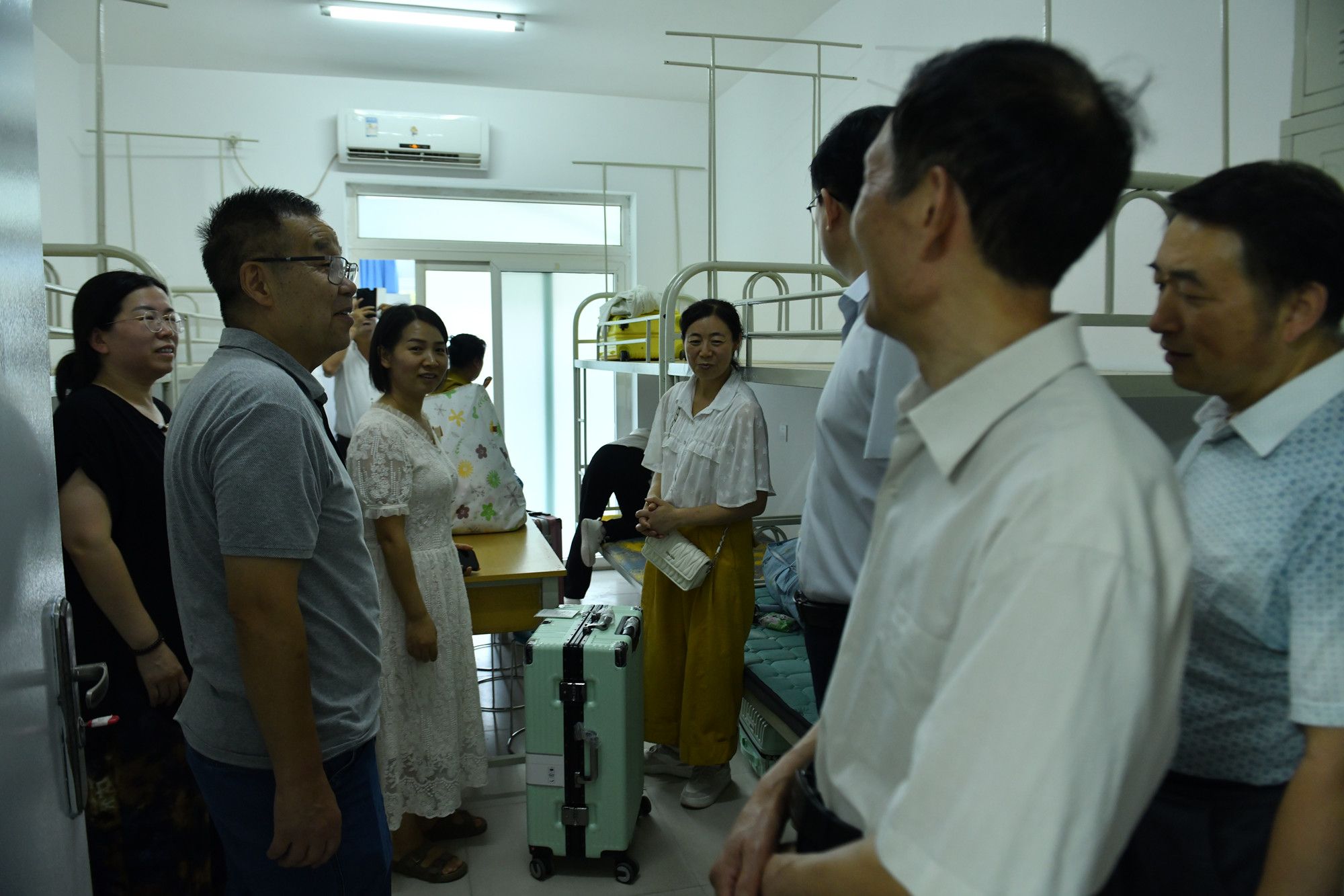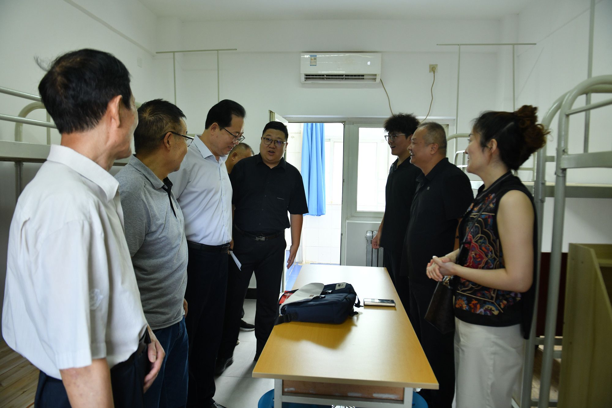 校领导一行先后走访了学校餐厅、学生宿舍、体育馆、新生物品及军训装备发放处、二级学院、新生接待处、缴费中心等,对住宿条件、消防安全保障、生活服务设施完善度、食品质量与安全控制等关键环节进行逐一检查。