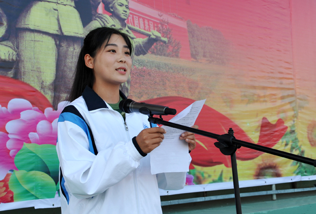 修葺一新的田径场秋雨后绿草如茵,场内彩旗猎猎,歌声飞扬;巨大的会标竖立在主席台正中,几十盆鲜花鲜艳夺目;主席台对面“励志践行”“笃学求实创新”十个大字熠熠生辉;主席台两侧十个红色气球载着大幅标语迎风飞舞。由近4000名2015级新生组成的36个方队整齐的列队在田径场内,怀着喜悦的心情期待检阅,6000多名12、13、14级学生和全体教职工坐满了看台,共迎新的学年。